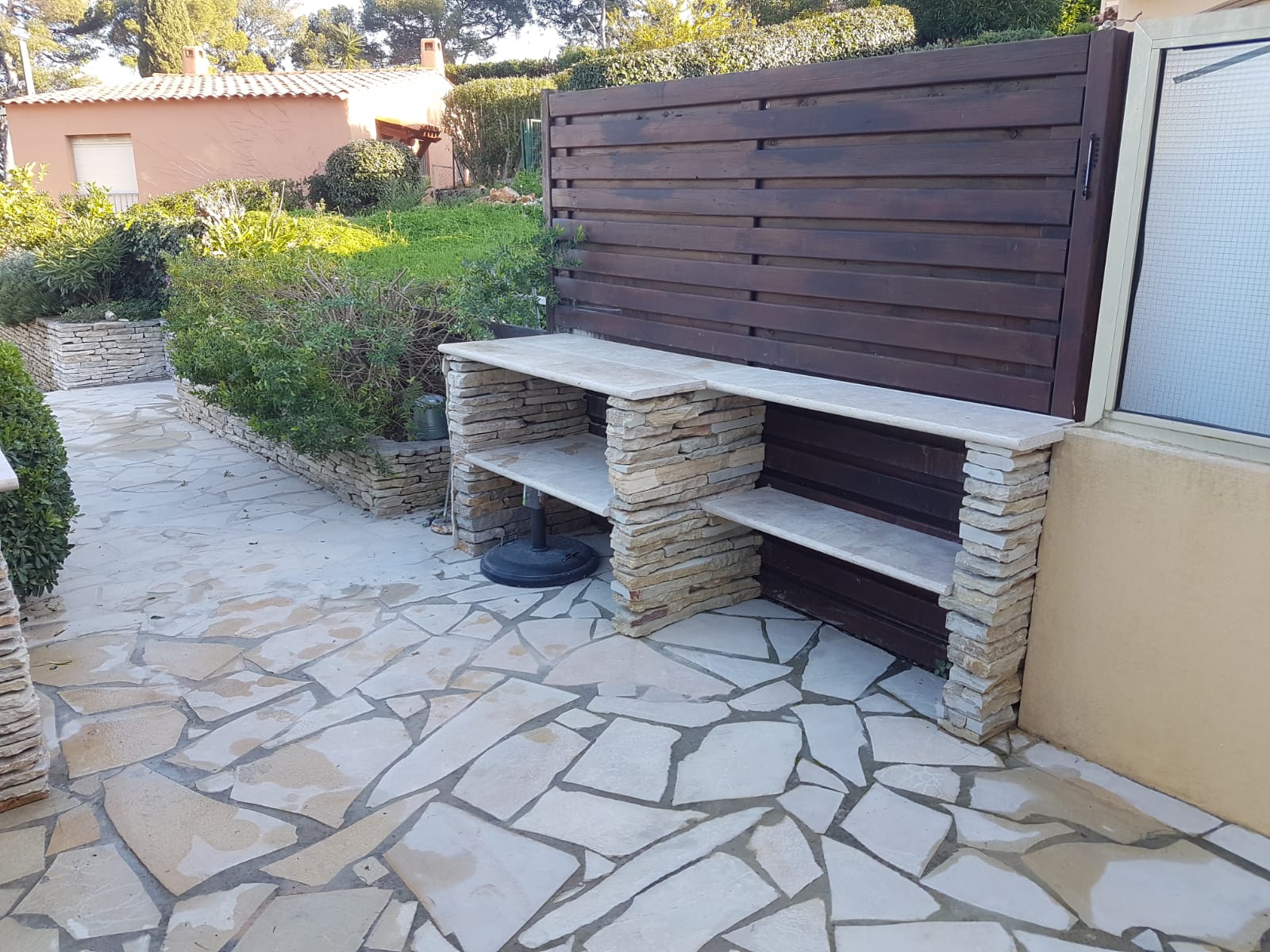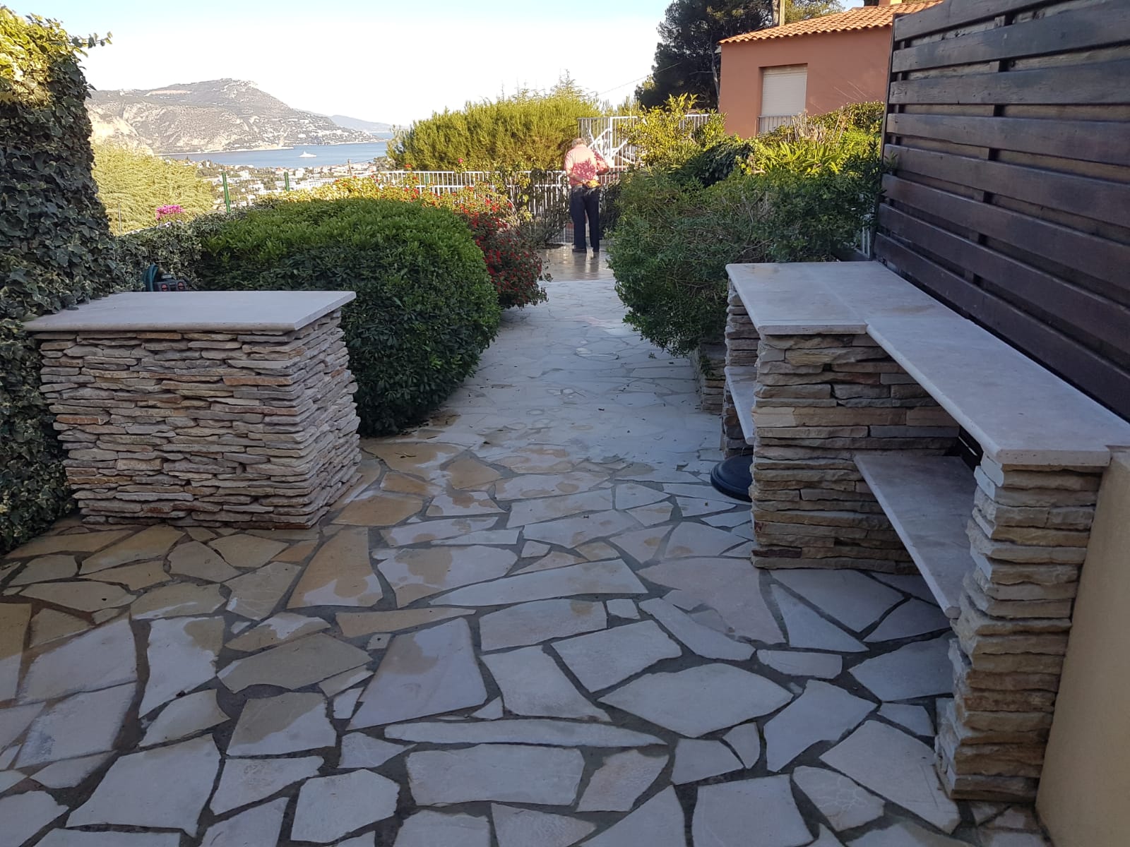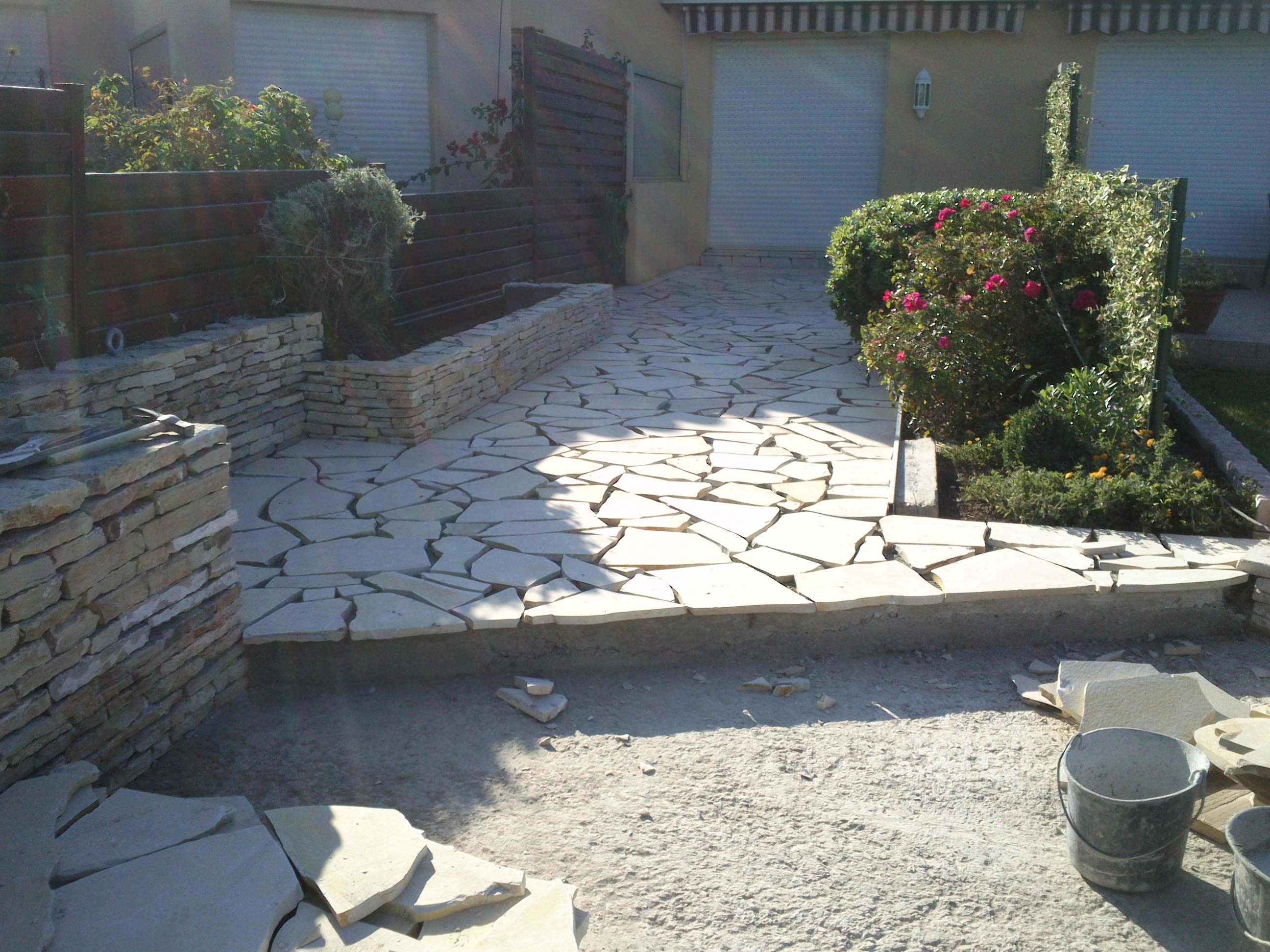 Nous vous présentons ici la rénovation des terrasses extérieur en dallage de pierre, muret ornementaux en pierre à sec.