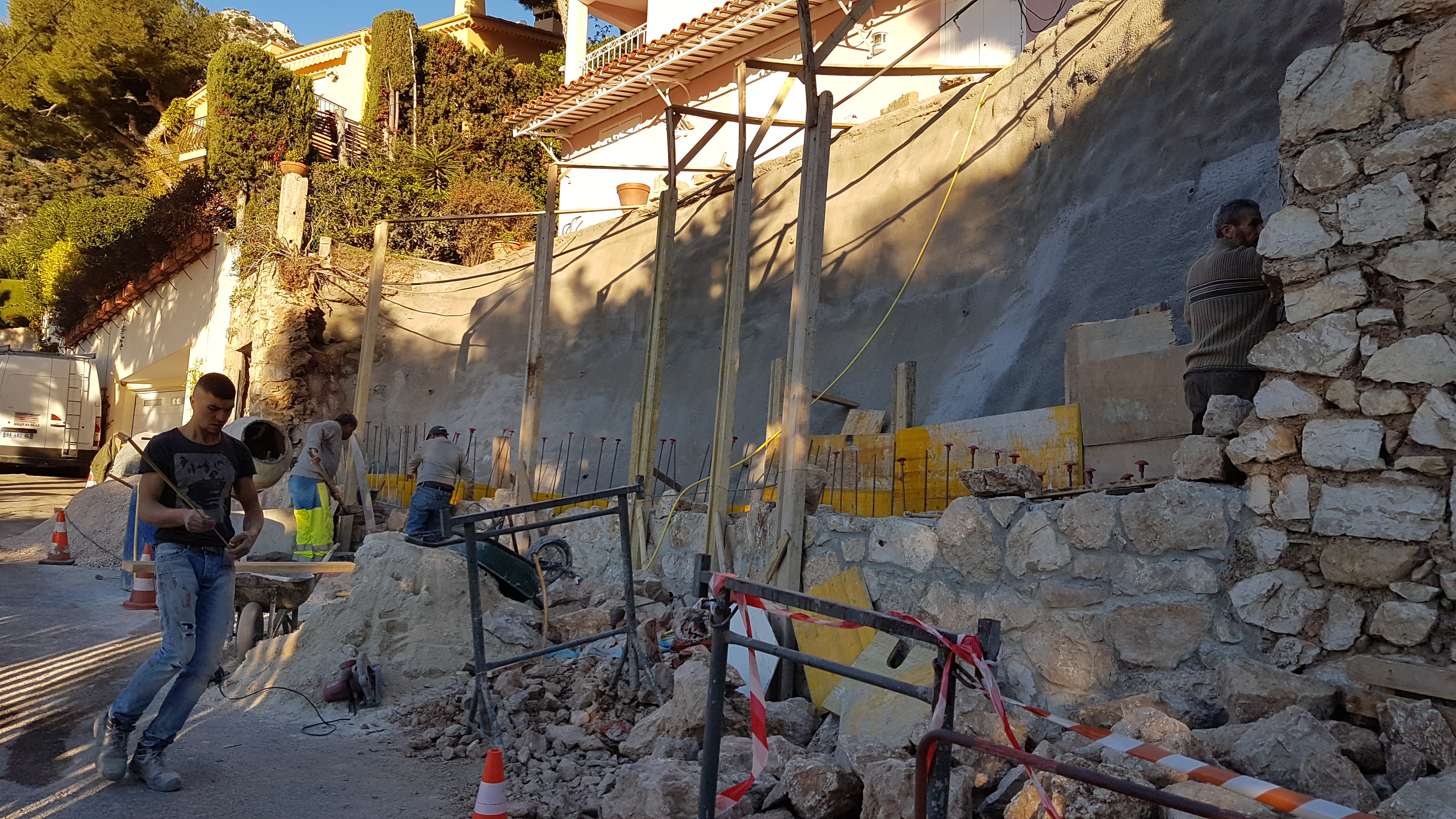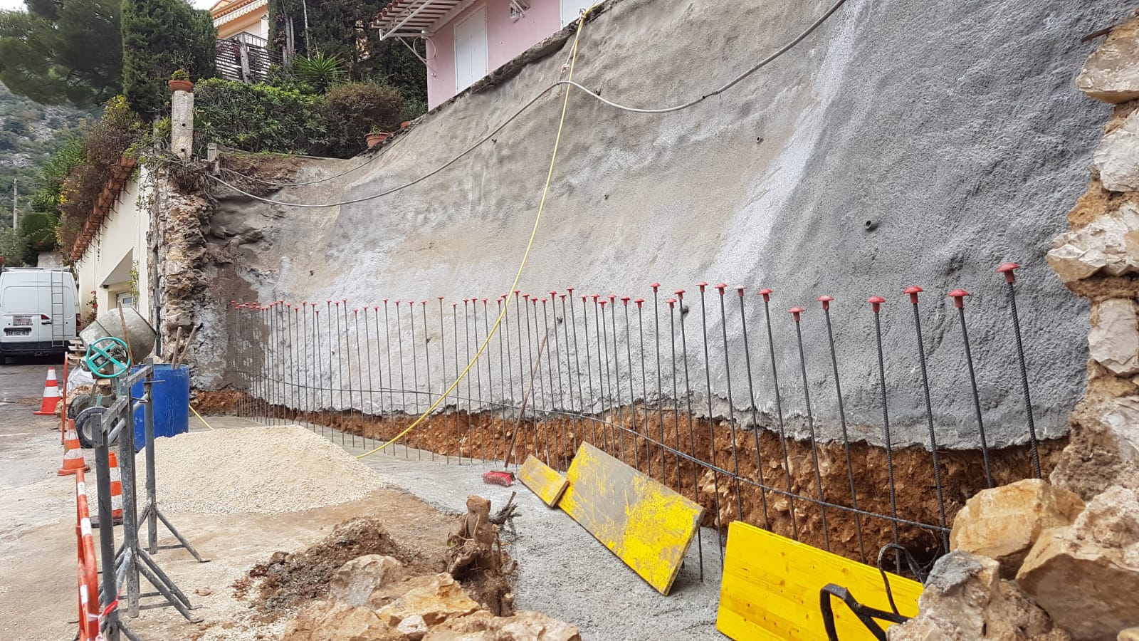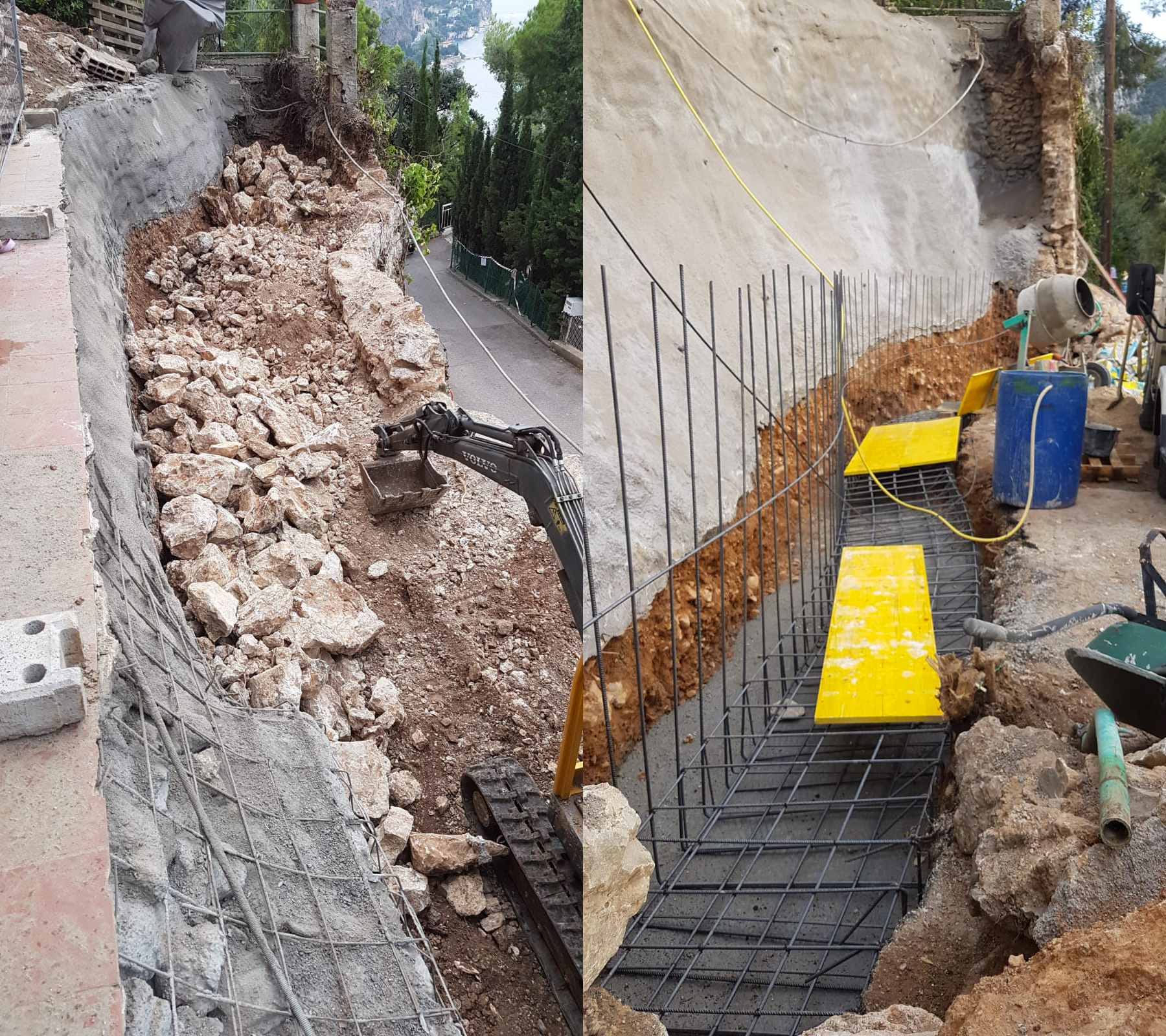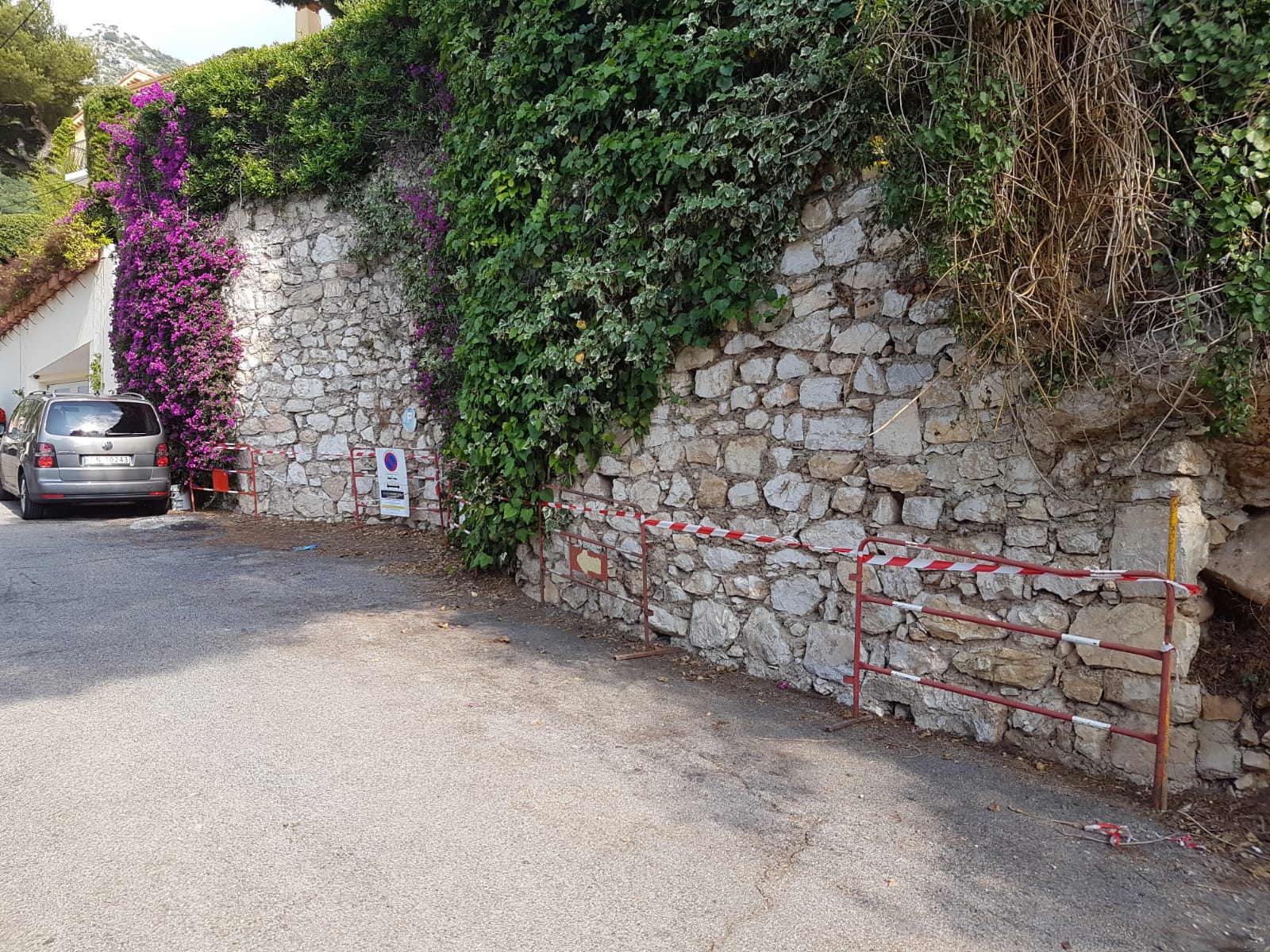 Réfection d'un mur de soutènement sur route en cours d'éboulement (instable et fissuré) sur toute la longueur, 17 mètres, à Eze sur mer De la DALLE TERRASSE (fissurée et affaissée): Protection du talus par béton projeté