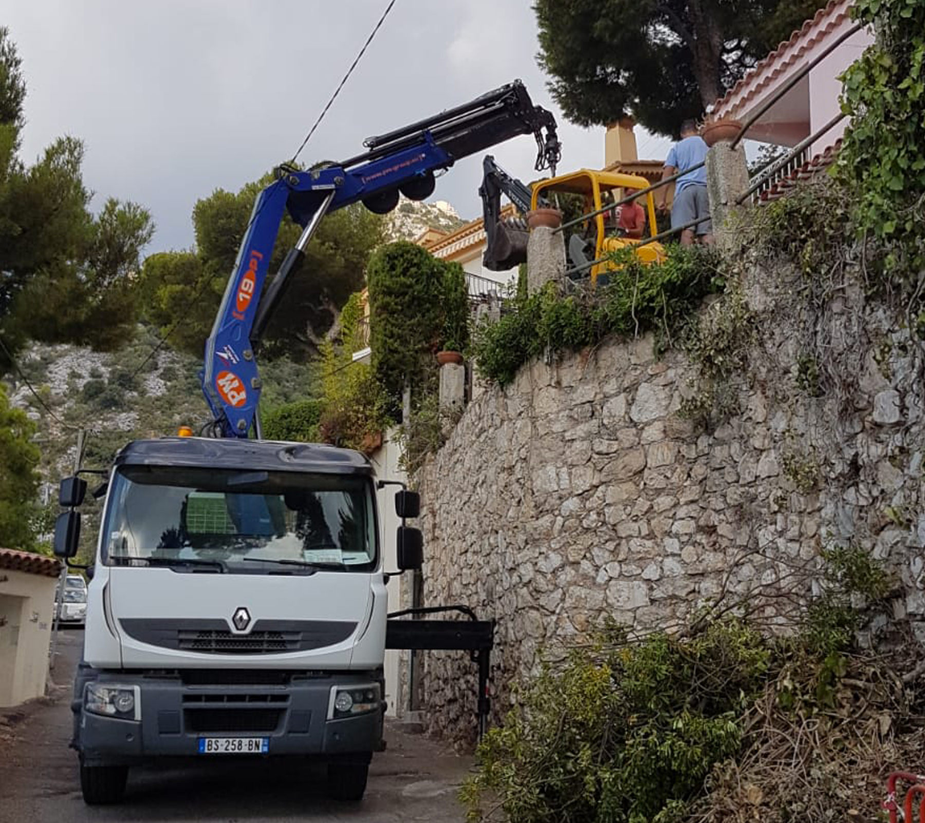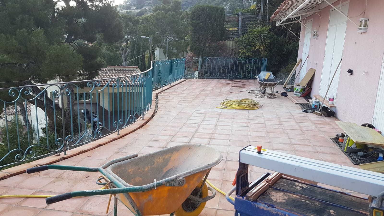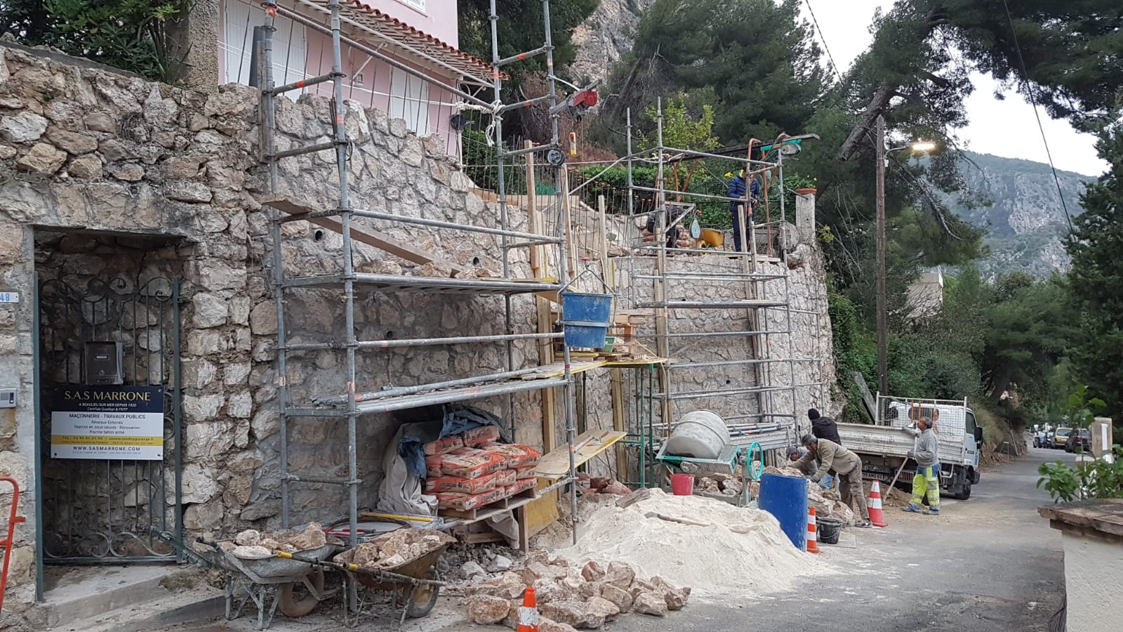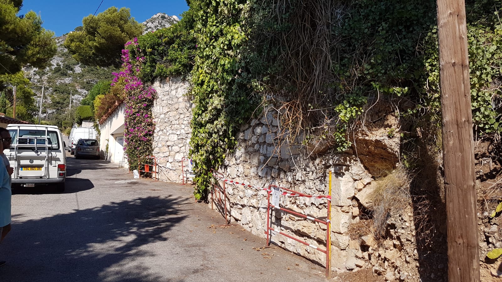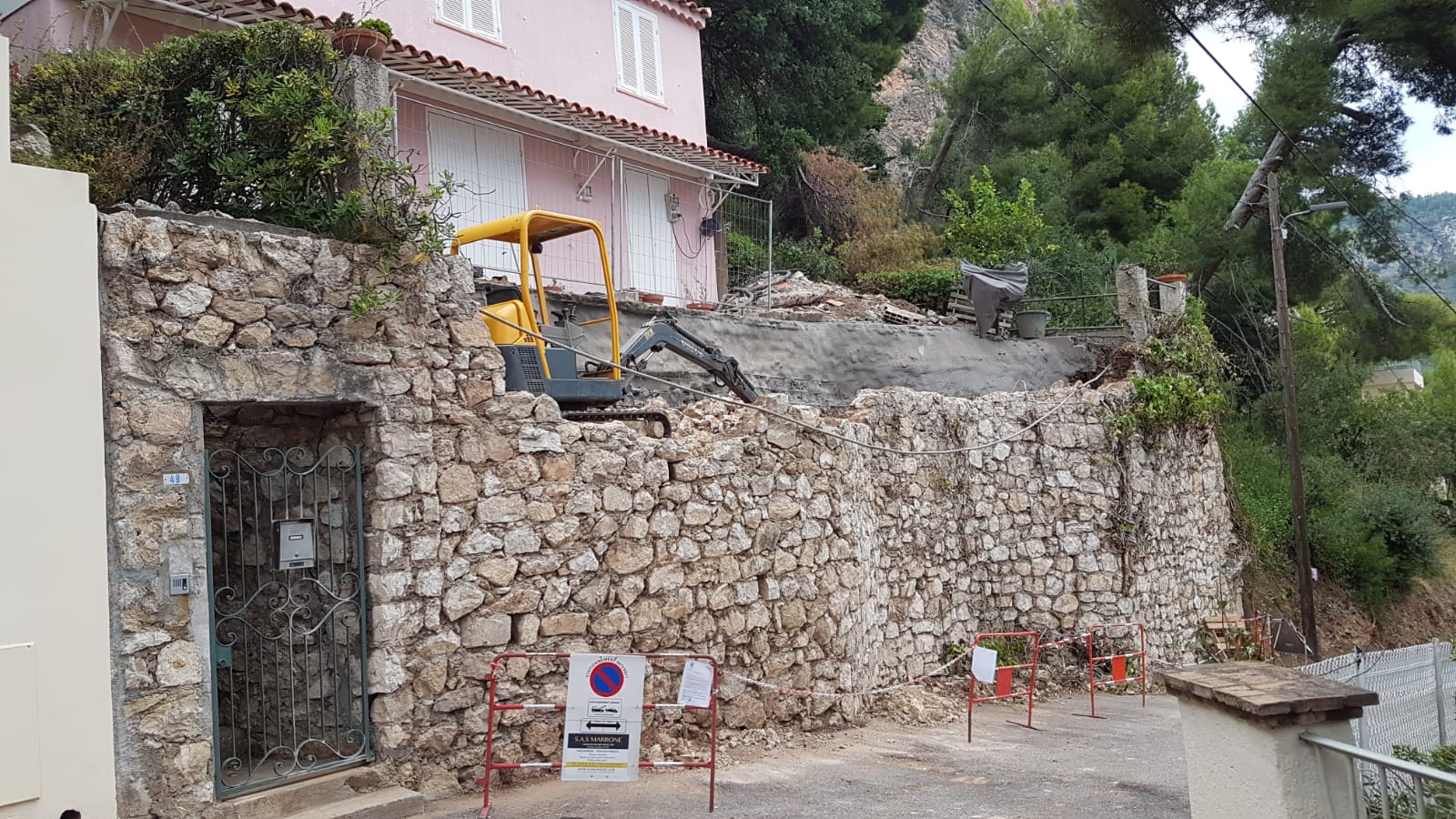 Réfection d'un mur de soutènement sur route en cours d'éboulement (instable et fissuré) sur toute la longueur, 17 mètres, à Eze sur mer De la DALLE TERRASSE (fissurée et affaissée): Protection du talus par béton projeté